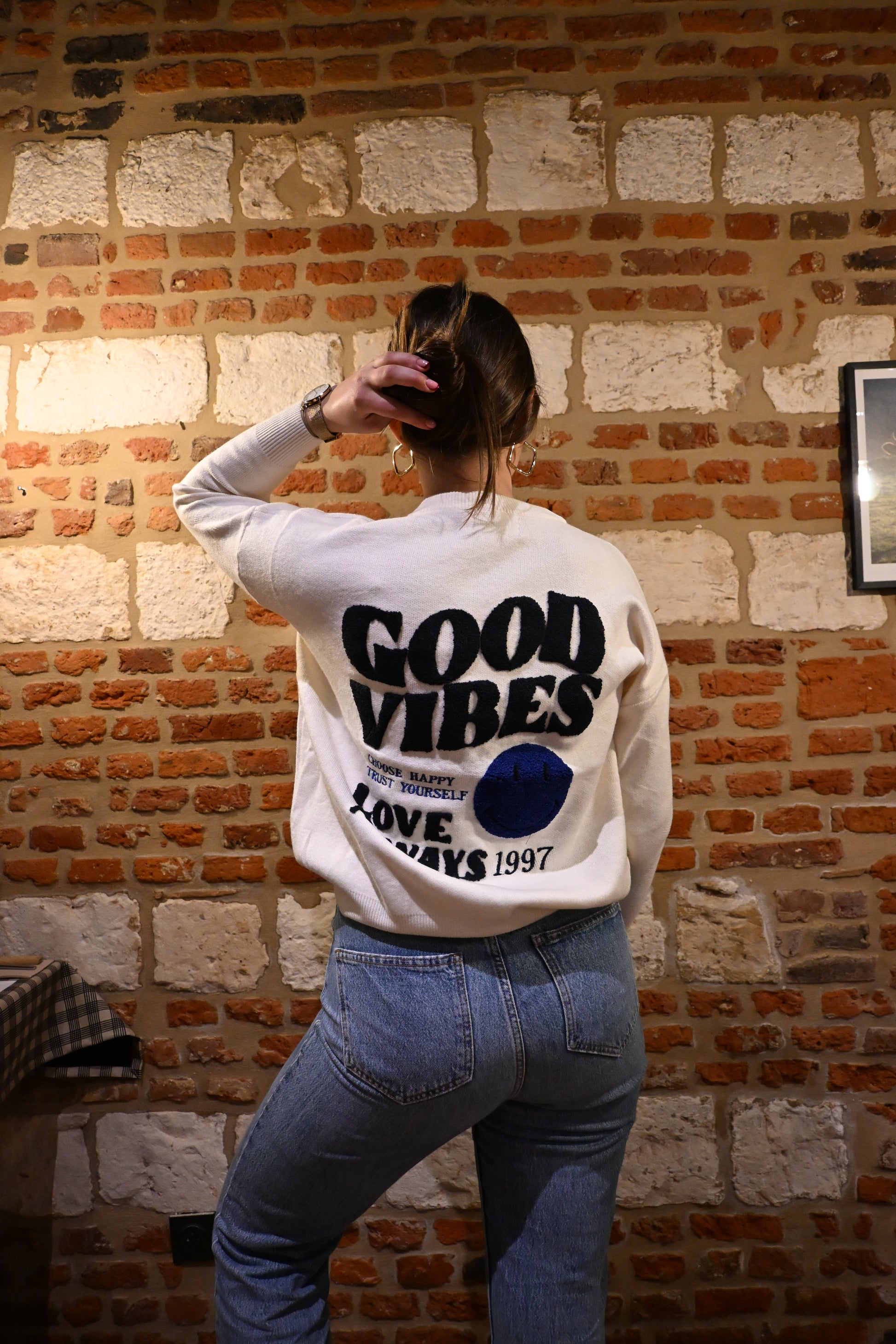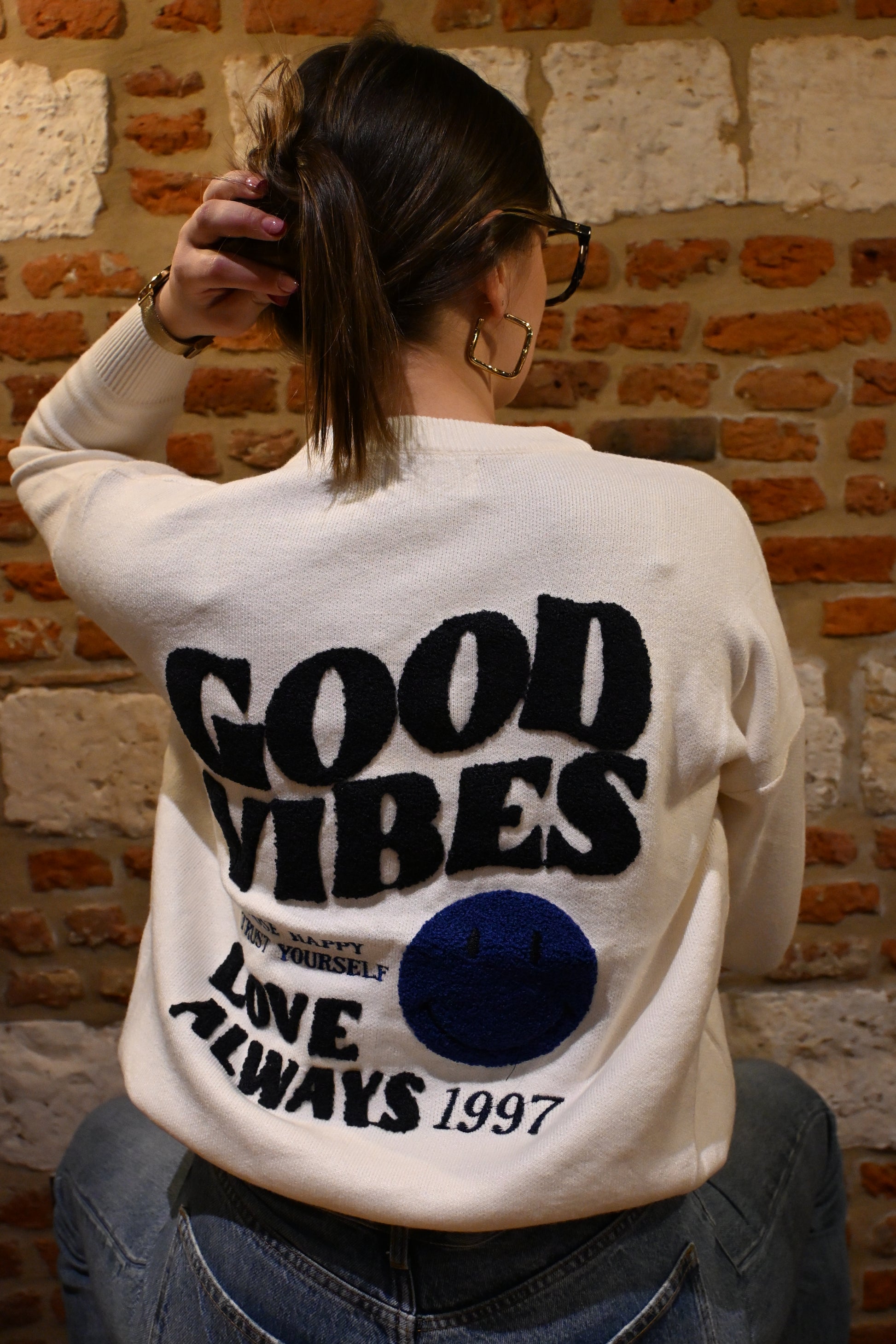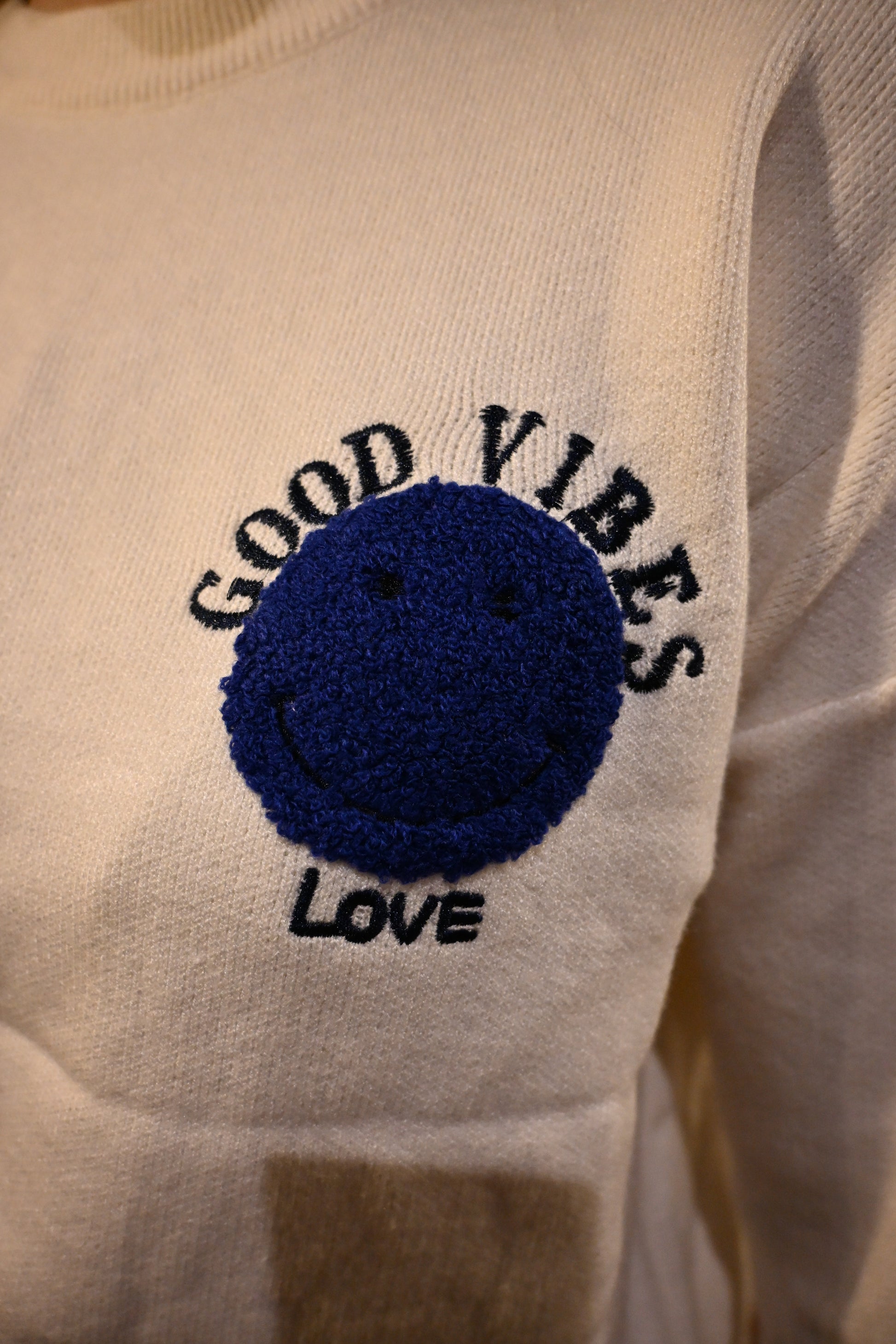 - Motif “GOOD VIBES” brodé en bleu sur le devant et le dos