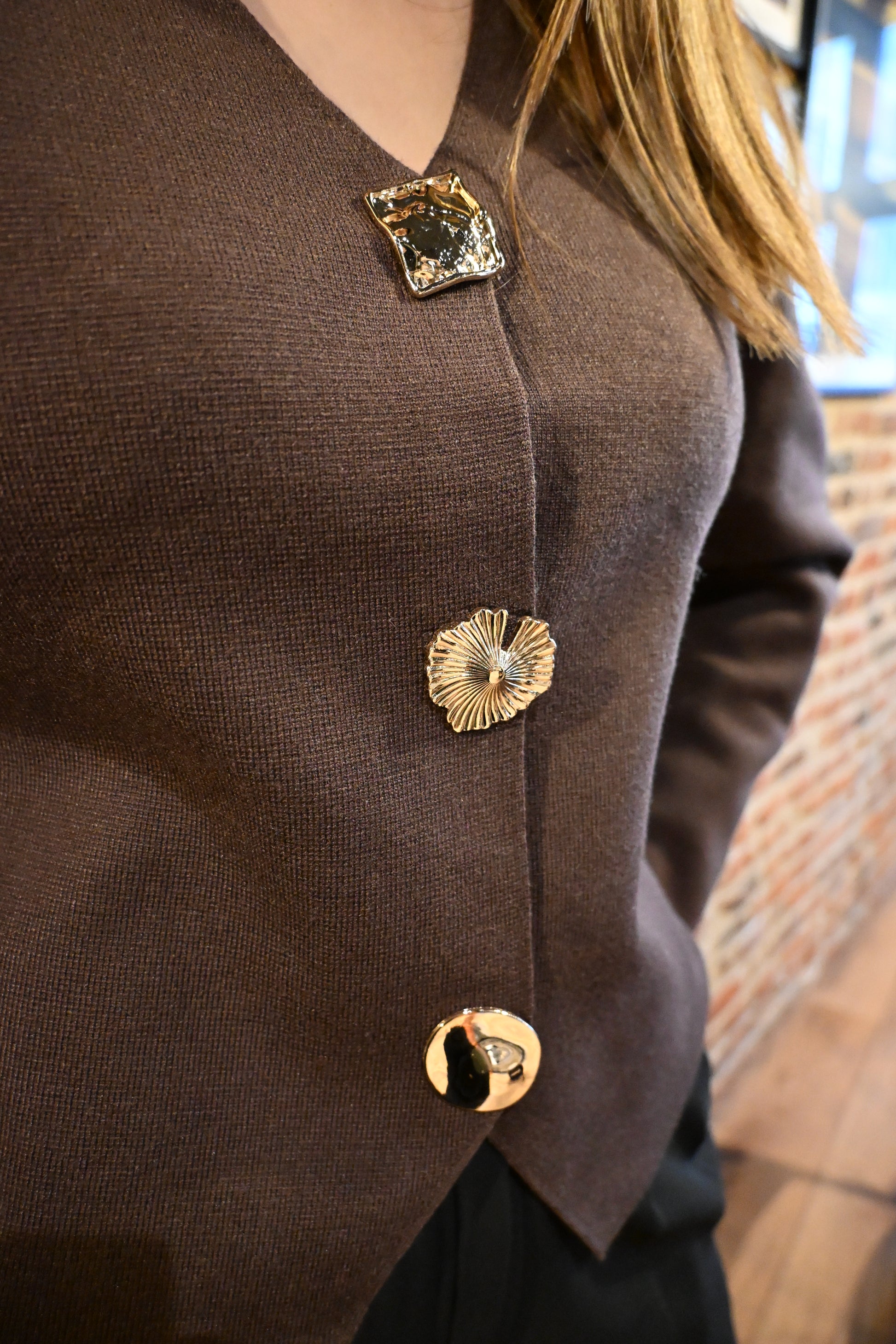 - Trois boutons dorés sur le devant